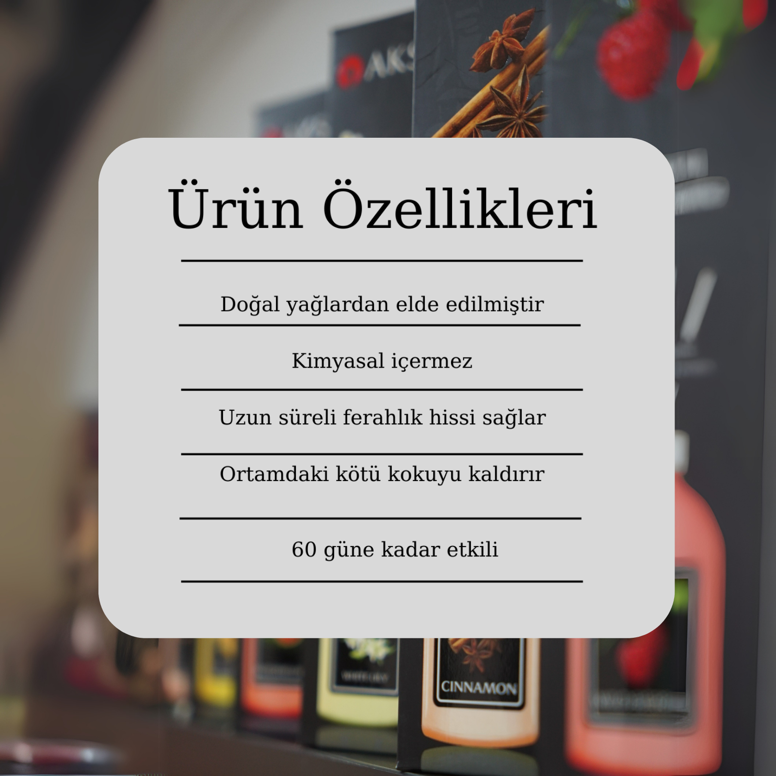 Evinize ferahlatıcı ve taze bir kokuyla taşıyor. Bu özel ürün, en kaliteli ürünleri bir araya getirerek kalıcı ve etkili bir oda kokusu yaratmak için özenle formüle edilmiştir.